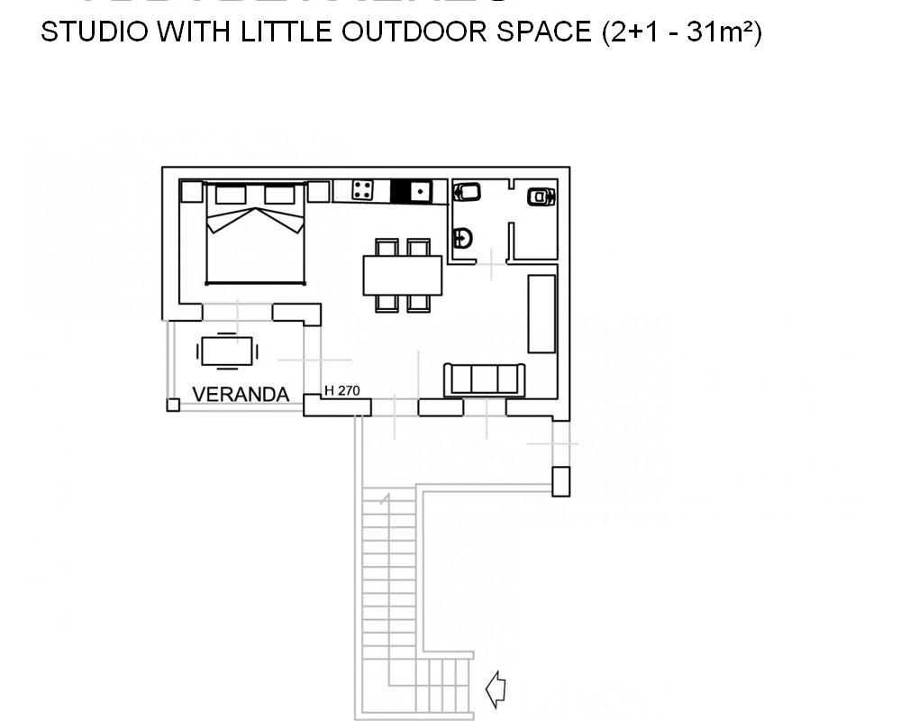 ACCOMMODATION: 1ST Fl.: (31 m2) living/dining room (TV) with double sofa bed and kitchen corner (oven, freezer), 1 double bed, 1 bathroom with shower (no window, no bidet). Little terrace equipped for outdoor dining.